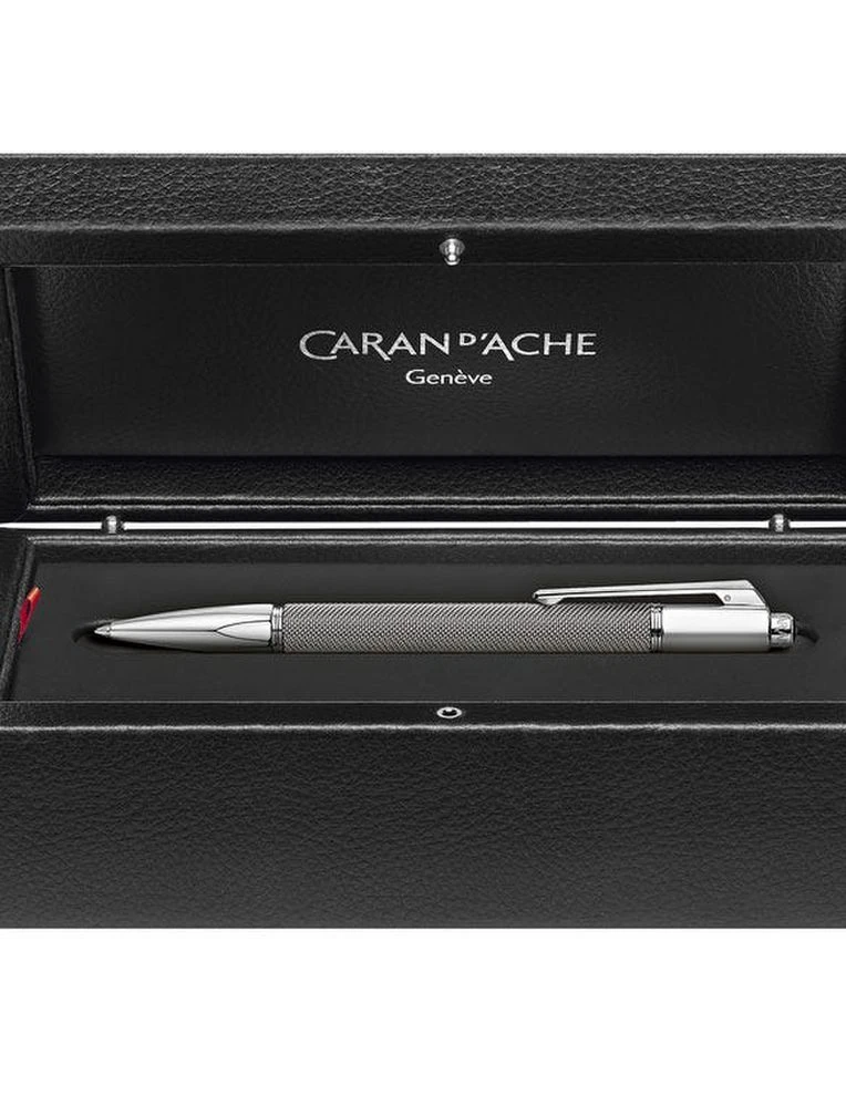 Caran d’Ache Varius Ivanhoe Ballpoint Pen. A functional yet elegant pen with contemporary styling, the Ivanhoe has a chainmail effect barrel and rhodium-plated trim.
