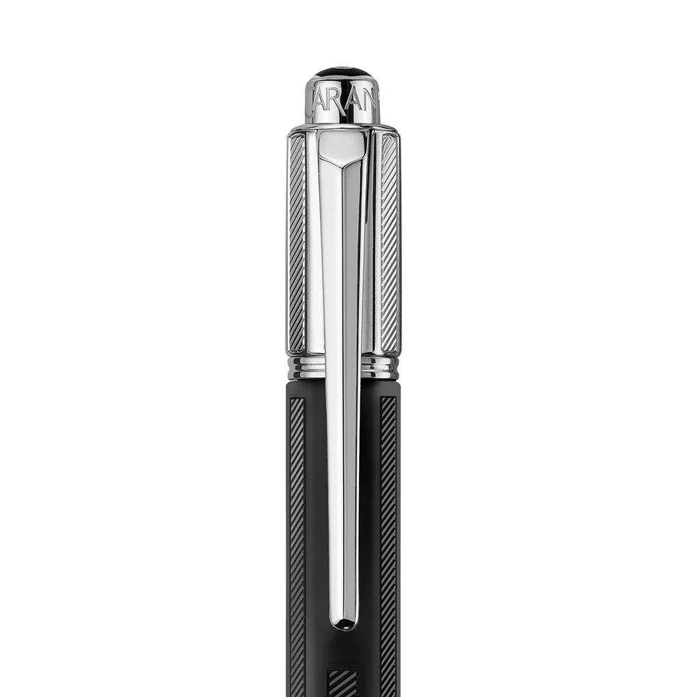 Varius Rubracer takes a material with a well defined character and reveals all the power of its personality. Its body of black rubber with guillochage decoration gives the new instrument an imposing elegance that is perfectly in tune with contemporary city life. And its strong profile is accentuated by the striking visual and tactile contrast of the materials: soft and matte for the rubber, polished and sparkling for the rhodium-coated silver trim. A screw adds a touch of vibrant modernity to the body of the pen. The sense of refinement extends to the cap with its delicate guillochage and its new jointed clip. In the fountain pen, the cap conceals a new, larger nib.