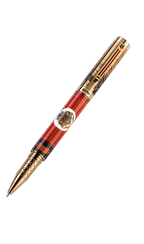 Weighting, finishing and detailing point to a writing instrument primed for academic performance. The Hogwarts school shield and a pair of dapper enamelled stripes decorate a durable, spring- loaded clip.