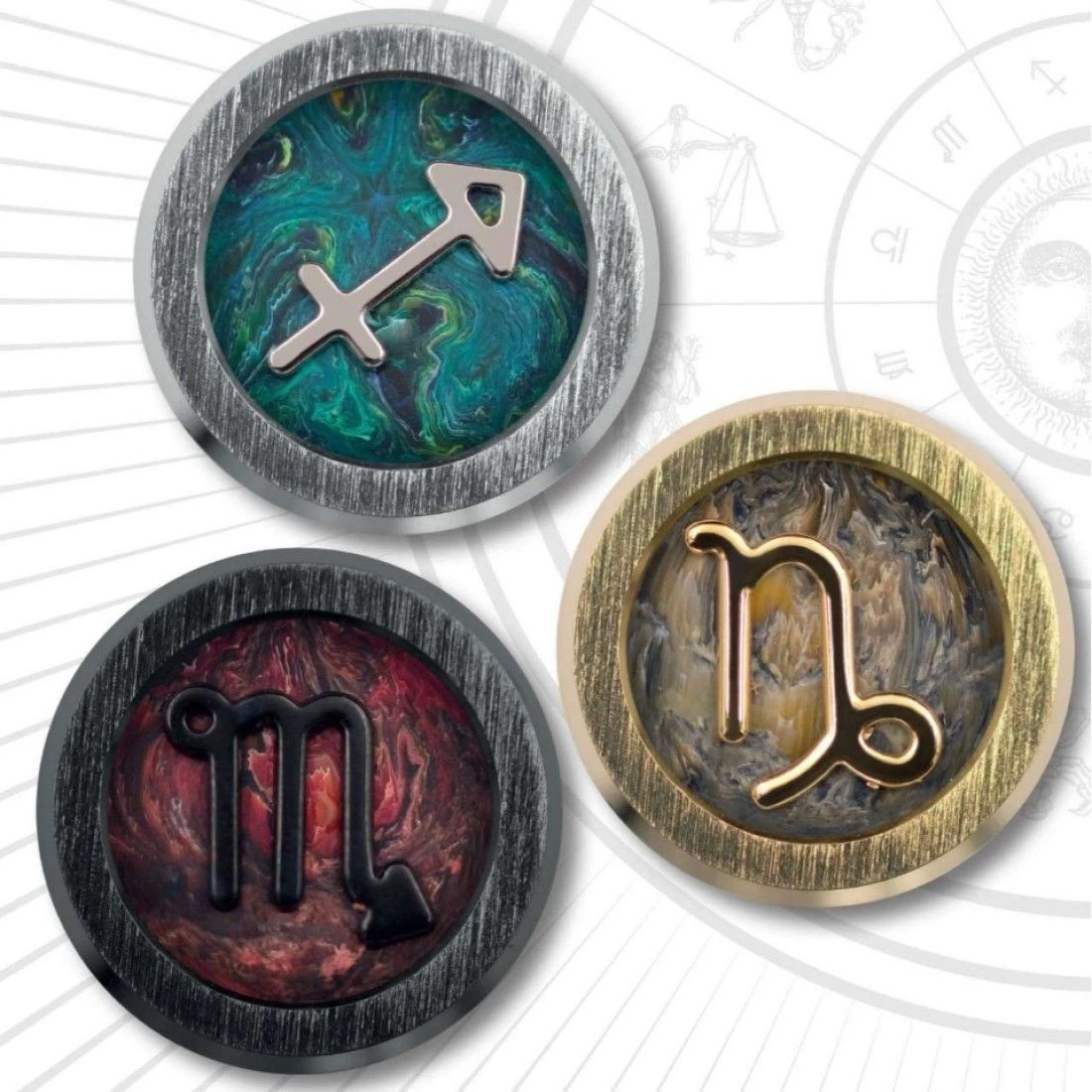 The elegant simplicity of ZERO provides an ideal canvas for astrological exploration. Sinuous resin textures are framed by bold steel hardware punctuated with sapphire crystal: a window onto a zodiac symbol cast in solid metal.Â