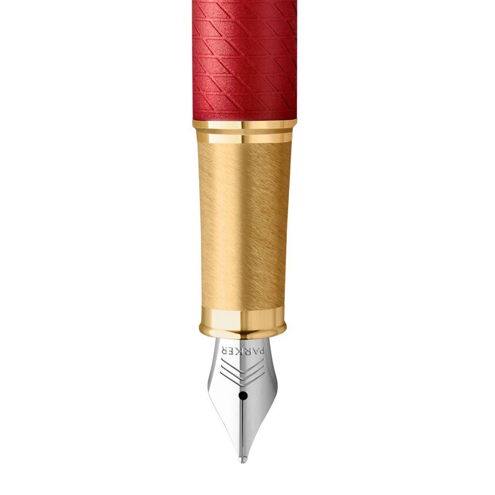 Give your writing an expression of refined style with this Parker IM Red Gold fountain pen, designed to be a reliable and high-performance accessory. The silhouette of the pen is constructed from anodized aluminium with a sand-blasted matte silver finish, which is enhanced by a timeless graphic engraving.