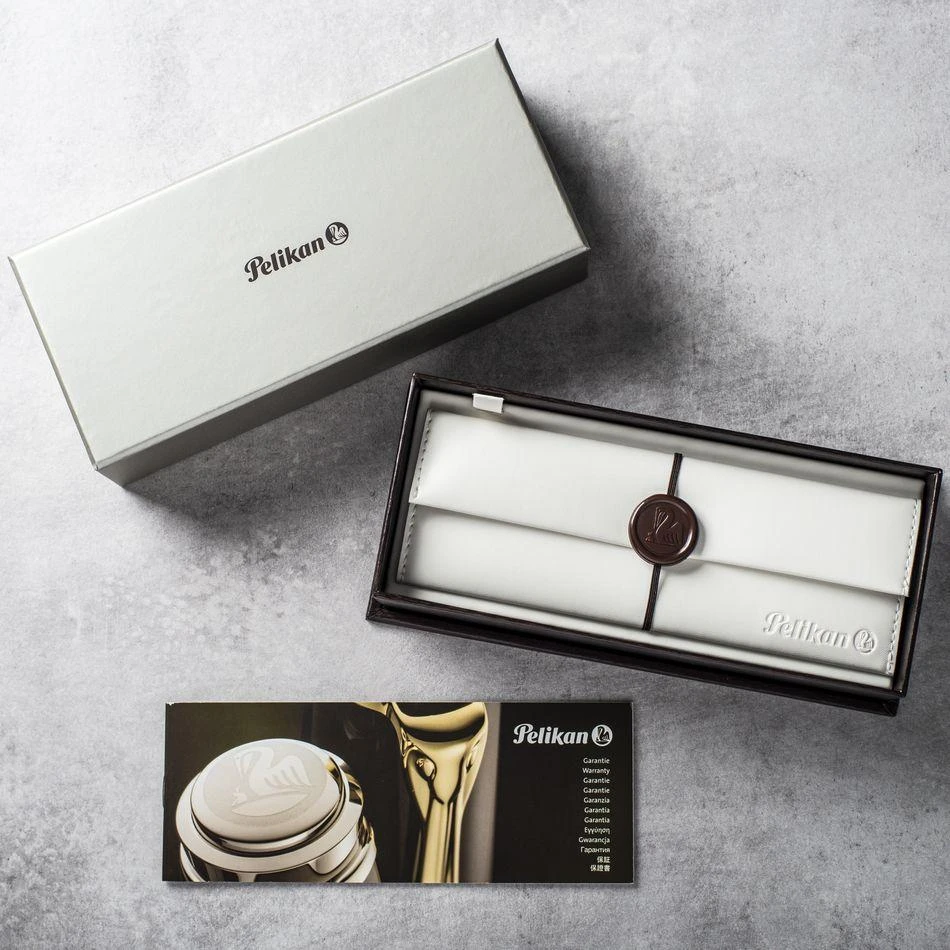 The gift box included is also pictured and has a removable lid and an ivory coloured faux leather pouch for protecting the pen when being stored or carried. The pouch can take one or two pens.